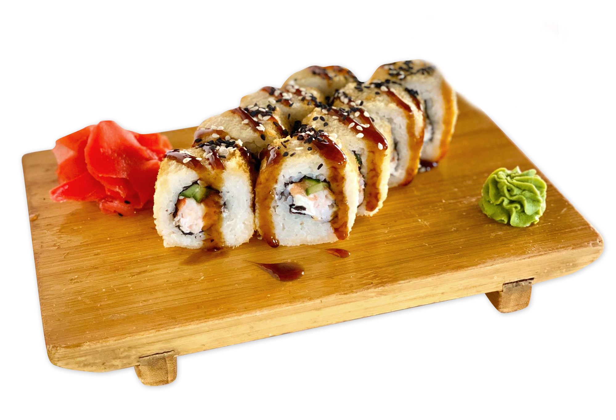 Рис, нори, сливочный сыр, огурец, тигровые креветки, лосось, соус унаги, кунжут. имбирь, васаби
