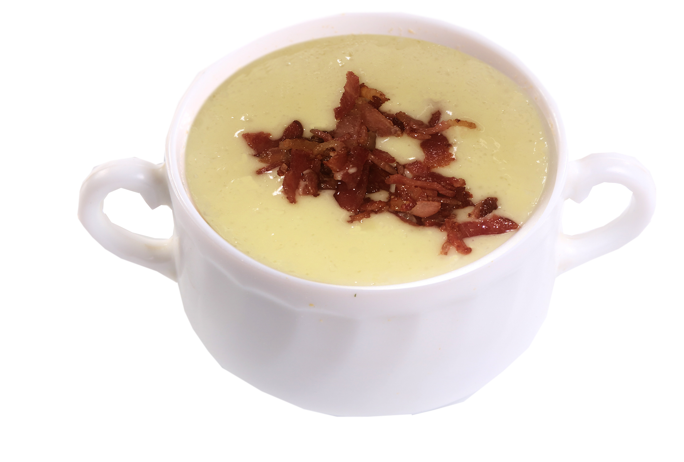 Сырный крем-суп на курином бульоне с картофелем и жареным беконом.