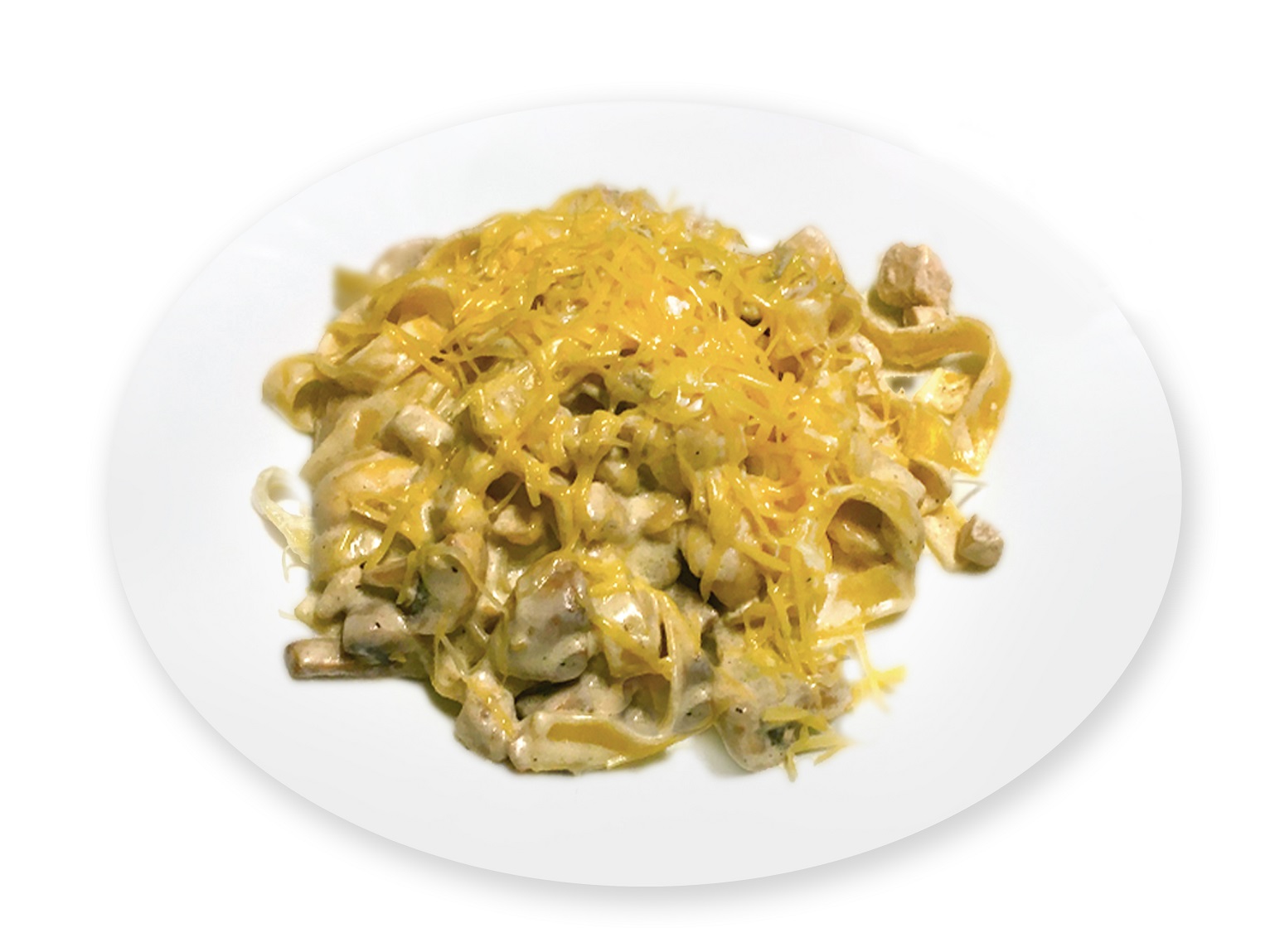 Паста, куриное филе, шампиньоны, сливки, специи, сыр Пармезан