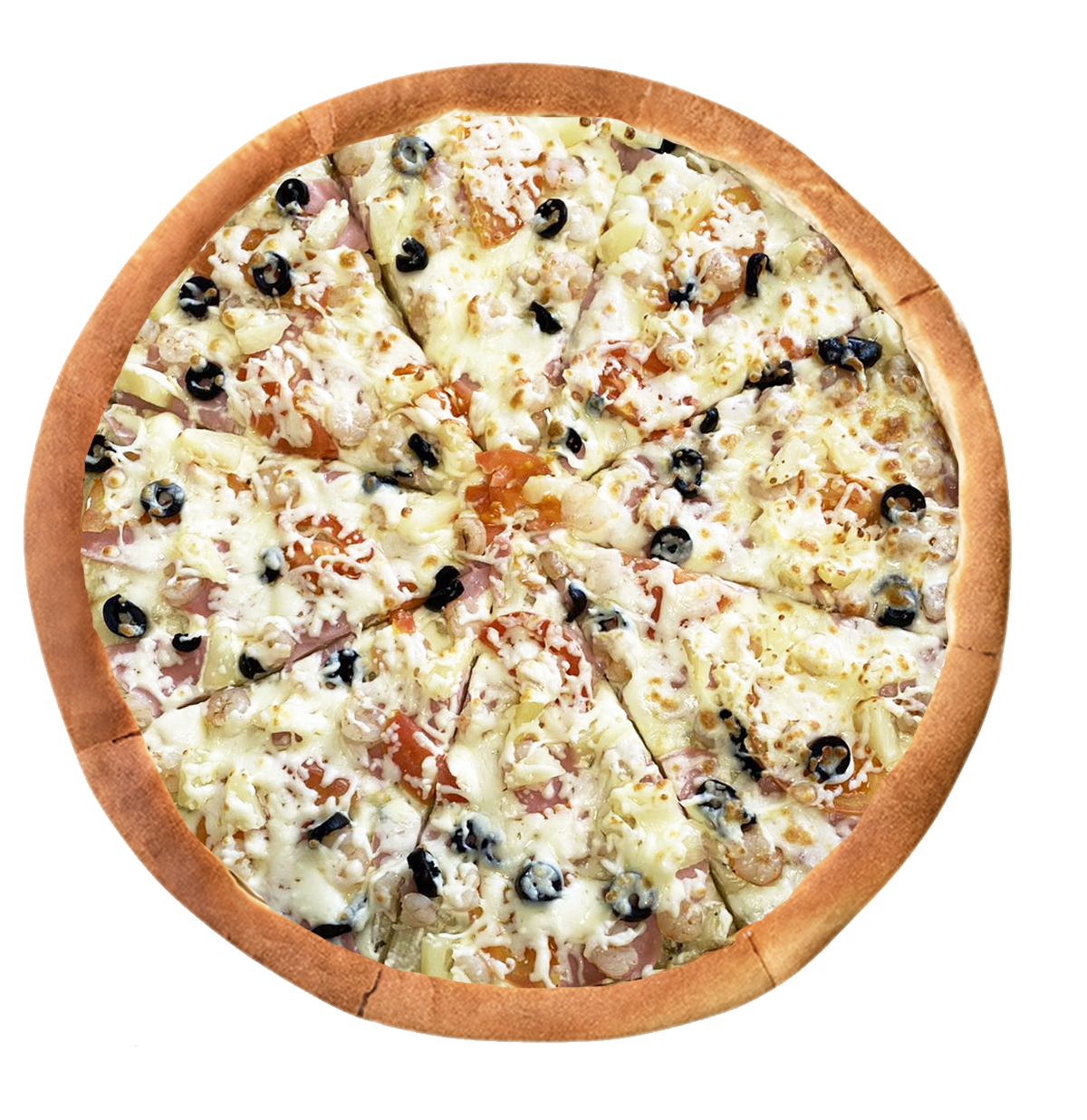 Ветчина, томаты, креветки, соус Цезарь, ананасы, маслины, моцарелла.
