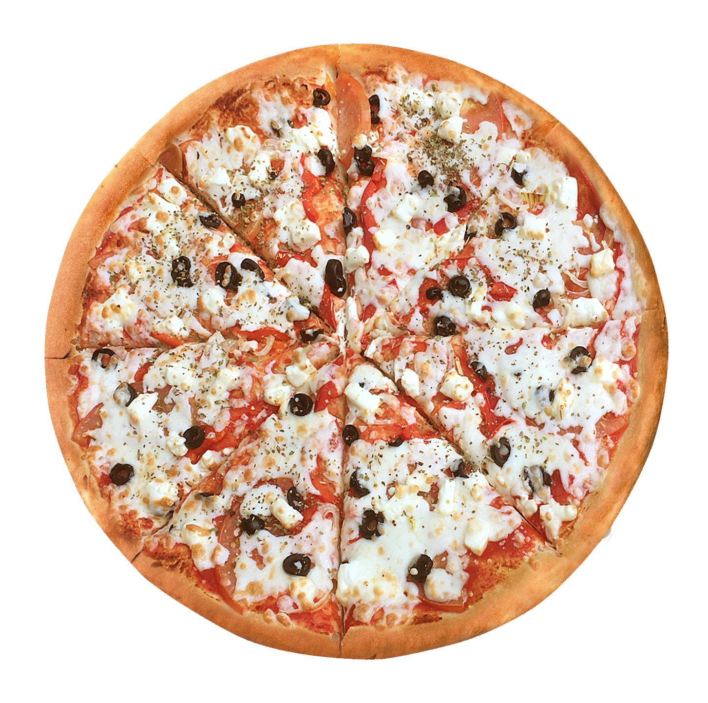 Маслины, томаты, болгарский перец, сыр фетакса, репчатый лук, орегано, соус мутти, моцарелла.