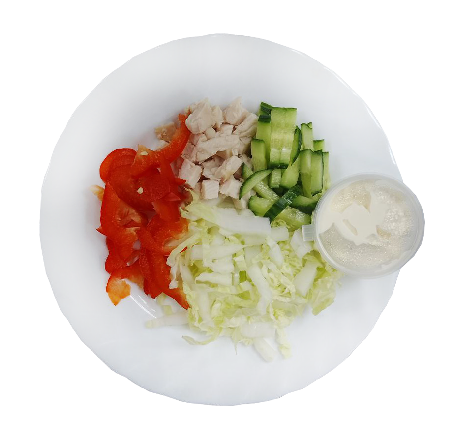 Пекинская капуста, копченая куриная грудка, болгарский перец, огурец свежий, майонез